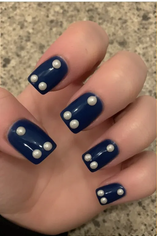 A rich, deep navy or midnight blue base with small pearl nail studs applied at the base of each nail or clustered on an accent nail. The combination of that deep blue and the luminous pearls has this really beautiful underwater quality — like something pulled from the bottom of the ocean in the best possible way.