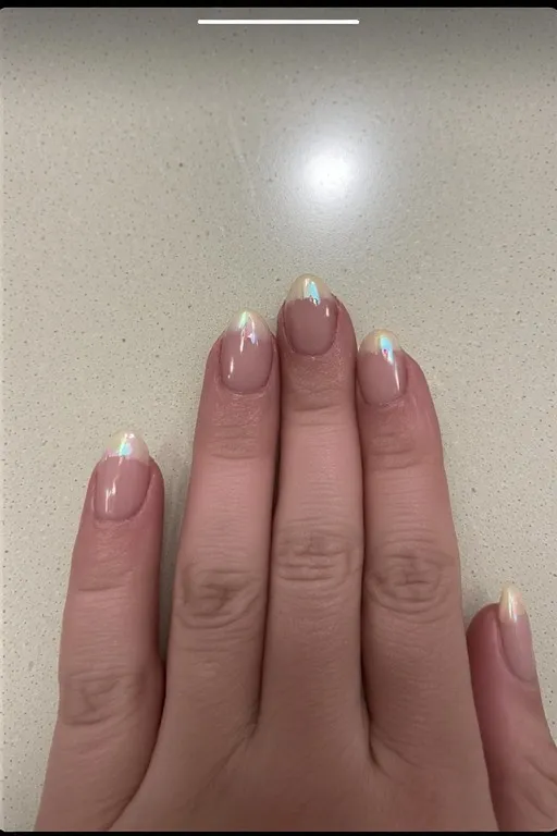 A classic French tip shape but using a soft iridescent or pearlescent polish for the tip instead of white — mimicking the inside of a seashell. The shimmer shifts between pink, lavender, and cream depending on the light, which creates this really magical quality that feels very beach-appropriate.