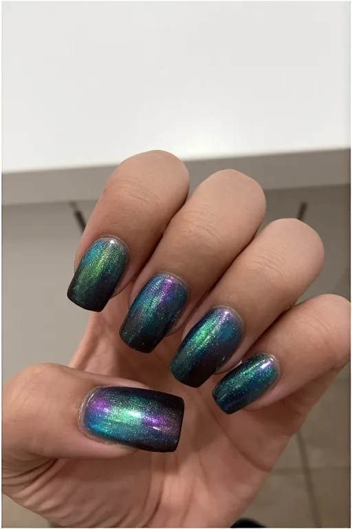 Holographic or duochrome polish that shifts between teal, green, blue, and purple depending on the angle — mimicking the iridescent quality of mermaid scales. It’s bold, it’s dramatic, and it is absolutely spectacular in direct sunlight or any bright light.