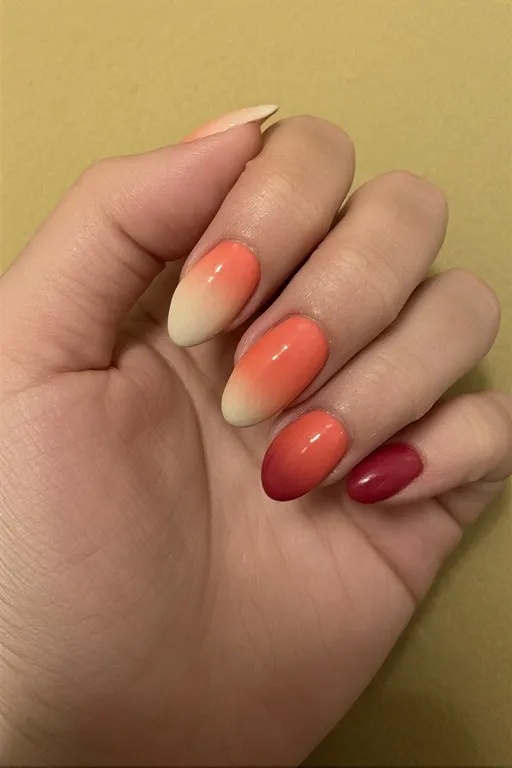 A gradient that moves from a warm sandy beige at the base through soft coral into a deeper reddish-pink at the tip — mimicking the warm color palette of a coral reef. It’s softer and more nuanced than a typical bright ombre and has this really beautiful organic quality that feels very ocean-inspired.
